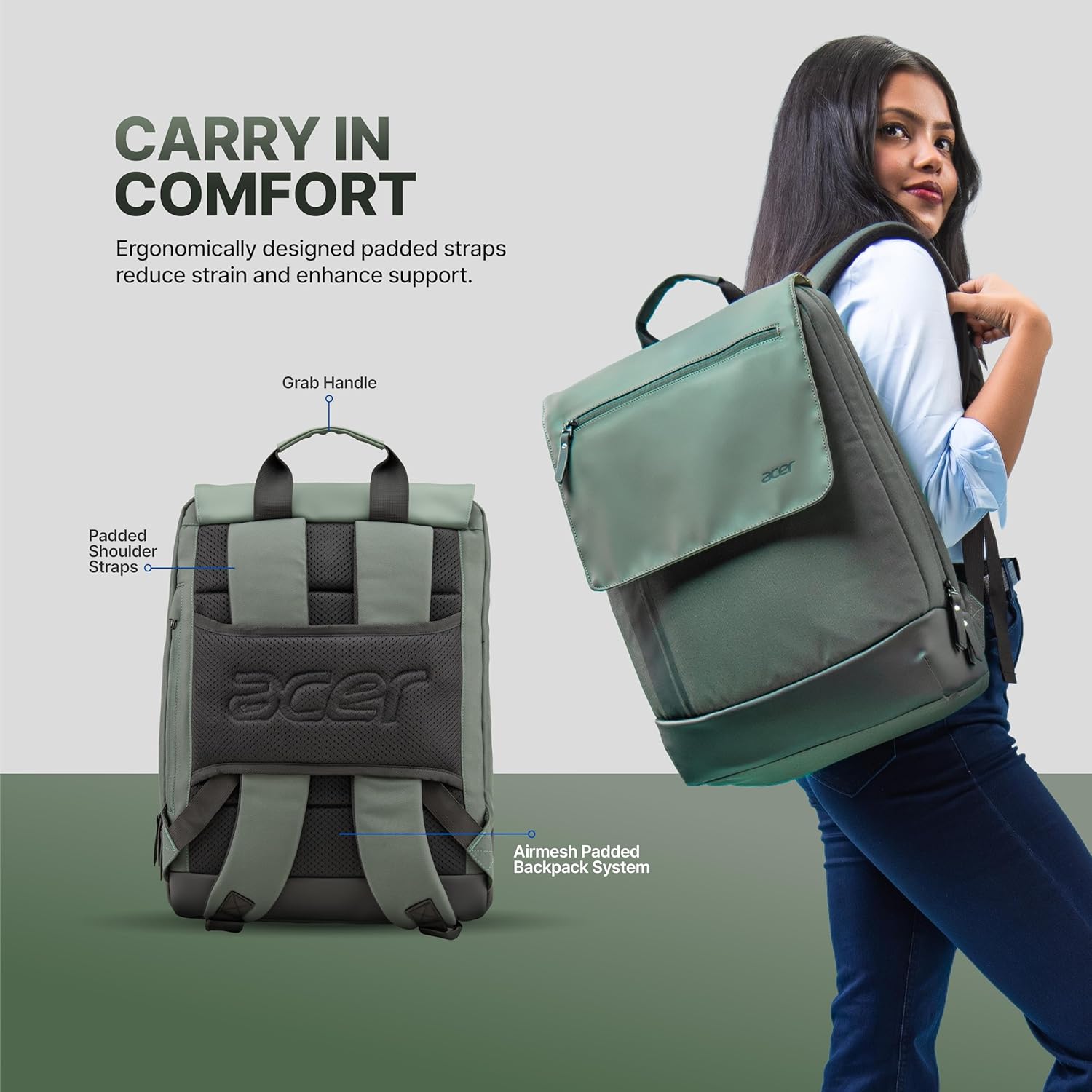 Acer UrbanLite Slim Backpack | Lightweight Travel & Office Bag | PU Molded Handle | Anti-Theft Pocket | Padded Laptop Compartment | Air-Mesh Back | Black & Forest Green | Water-Resistant Fabric