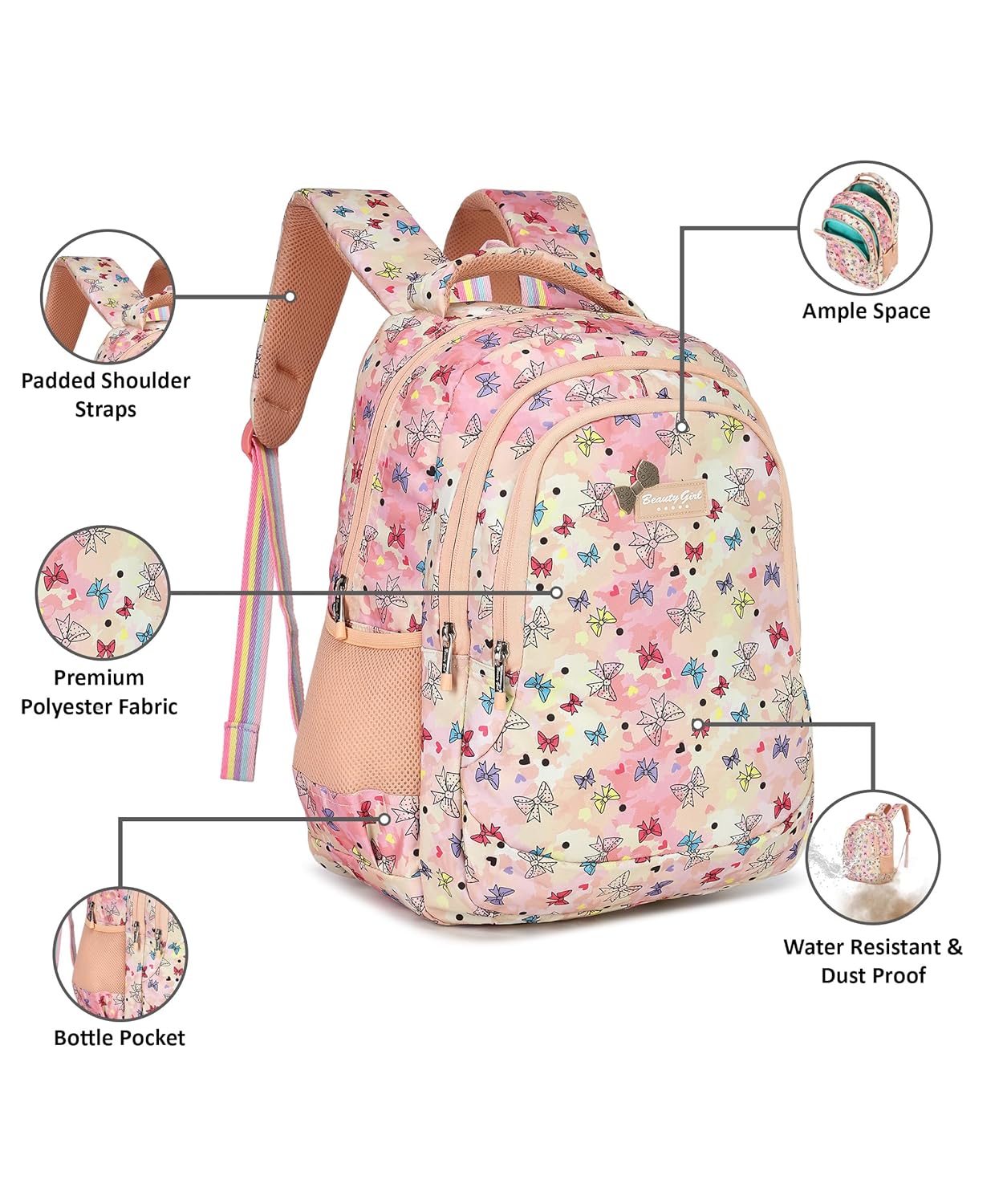 This school backpack for girls is perfect for those who appreciate a touch of whimsy. Branded with “Beauty Girl,” it is crafted from high-quality materials to ensure durability. The backpack includes padded straps and a back panel for added comfort during carrying. With multiple compartments and pockets, it provides ample space and organization for all school supplies.