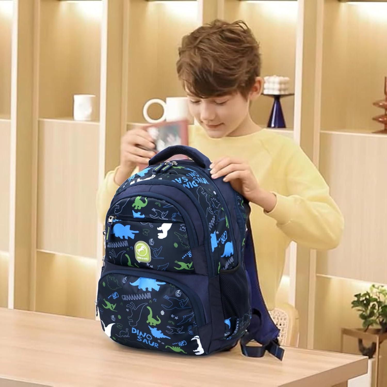 WEIGHT This Backpack is lightweight but Strong Fabric, to prevent back strain and long-term spinal misalignment. MATERIAL Vibrant Color and durable, water-resistant Polyester material and Unique Dinosaur prints, which make this boys school backpack be eye-catching. ERGONOMIC Ergonomic design that supports proper posture and weight distribution. SIZE The bag is proportionate to the child’s body size and age it hold all necessary school supplies without being too large or bulky. And also its height, width, and depth to suits the child’s needs.