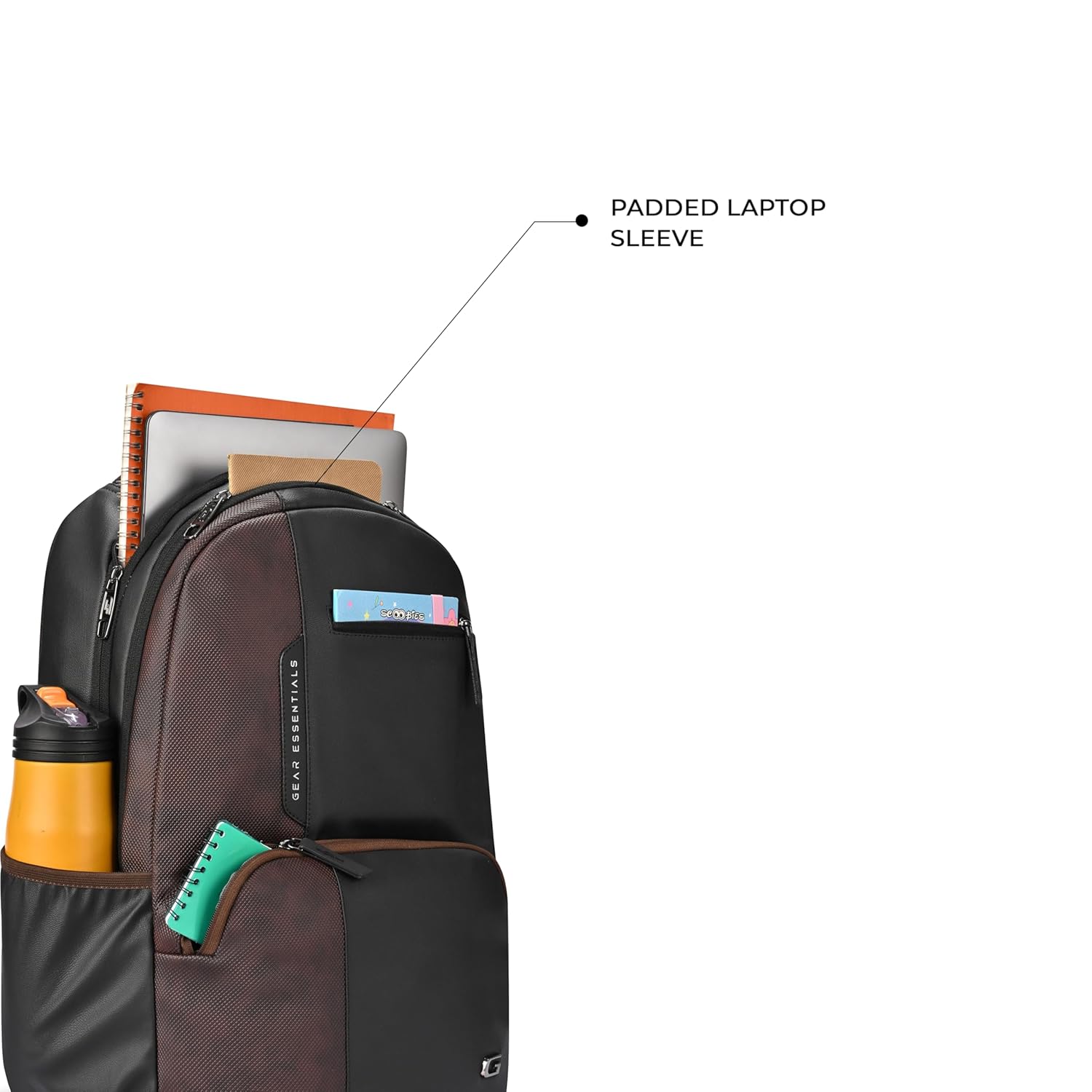 Ergonomic fit : Water repellant faux leather fabric : 2 main Compartments : 2 Bottle pockets : 2 Front quick access zip pockets : Padded Sleeve Fits Up To 15.6″ Laptop & Tab : Organizer : Grab Handle : Rain cover : Lightweight : Padded & adjustable shoulder handles : Optimized Back Panel with Premium Cushioning with Airflow Mechanism : Bar-Tacked Load Points : Heavy Duty Long Lasting Zippers.